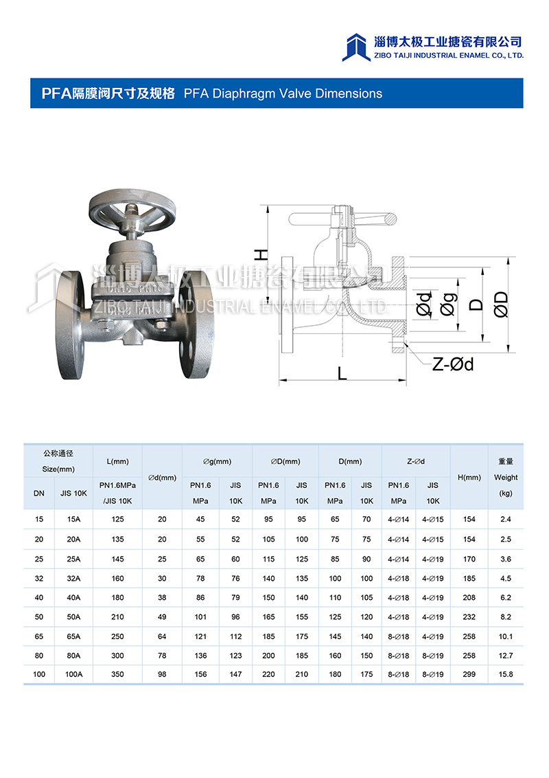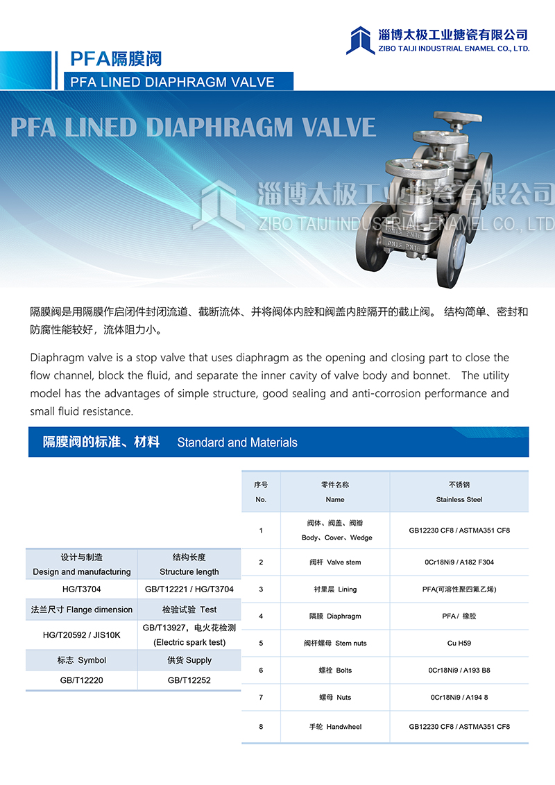 太極氟塑料PFA隔膜閥是用隔膜作起閉件封閉流道、截?cái)嗔黧w、并將閥體內(nèi)腔和閥蓋內(nèi)腔隔開的截止閥。結(jié)構(gòu)簡單、密封和防腐性能較好,流體阻力小。