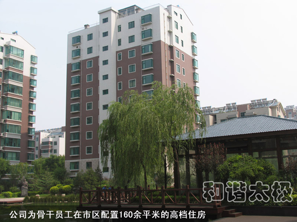 2008年,太極公司投資近8000萬元建成了職工公寓樓3座,戶外綠樹溪湖環(huán)繞,每戶面積170平米,統(tǒng)一配置60寸夏普電視等。所建成的職工單身公寓樓采用四星級(jí)標(biāo)準(zhǔn),共176間房,人均戶面積50平米,統(tǒng)一配置電視、網(wǎng)絡(luò)、洗浴間、床柜、空調(diào)、暖氣、桌椅等。而且單身公寓內(nèi)設(shè)有3000余平方米的生態(tài)園林和高檔游泳池,一年四季綠樹茂盛常春。