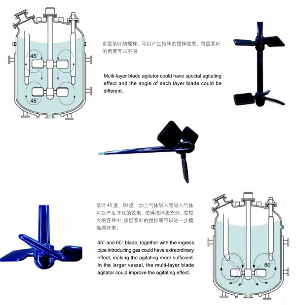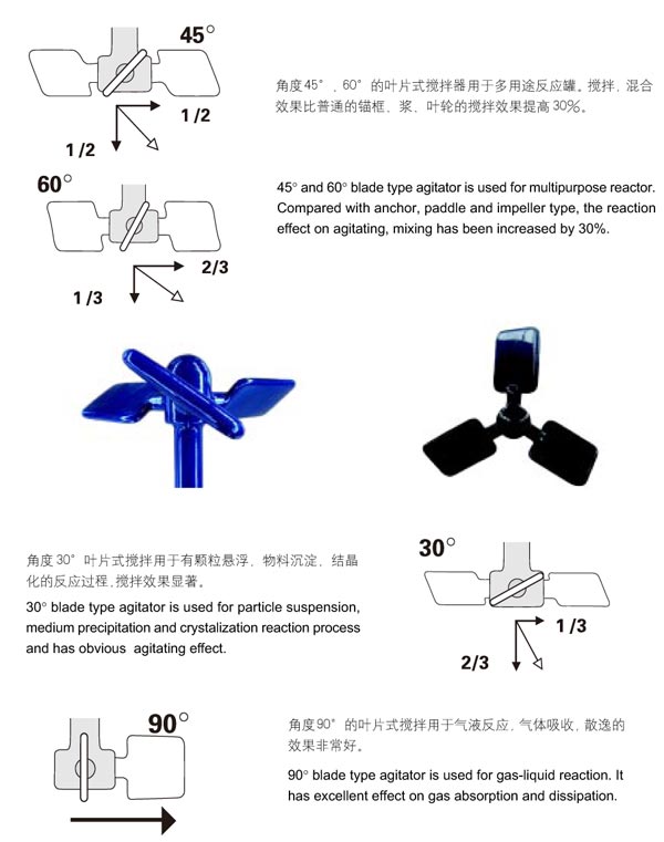 太極葉片式搪玻璃攪拌器:角度45°、60°的葉片式搪玻璃攪拌器用于多用途反應(yīng)罐。攪拌,混合效果比普通的錨式、框式、槳葉式、葉輪式攪拌效果提高30%。角度30°葉片式攪拌用于有顆粒懸浮物,物料沉淀,結(jié)晶化的反應(yīng)過(guò)程,攪拌效果顯著。角度90°的葉片式攪拌用于氣液反應(yīng),氣體吸收,散逸的效果非常好。多層槳葉的攪拌器,可以產(chǎn)生特殊的攪拌效果,每層槳葉的角度可以不同。槳葉45讀、60度,加上氣體導(dǎo)入管導(dǎo)入氣體可以產(chǎn)生非凡的效果,使得攪拌更充分。在較大的容器中,多層槳葉的攪拌器可以進(jìn)一步提高攪拌率。