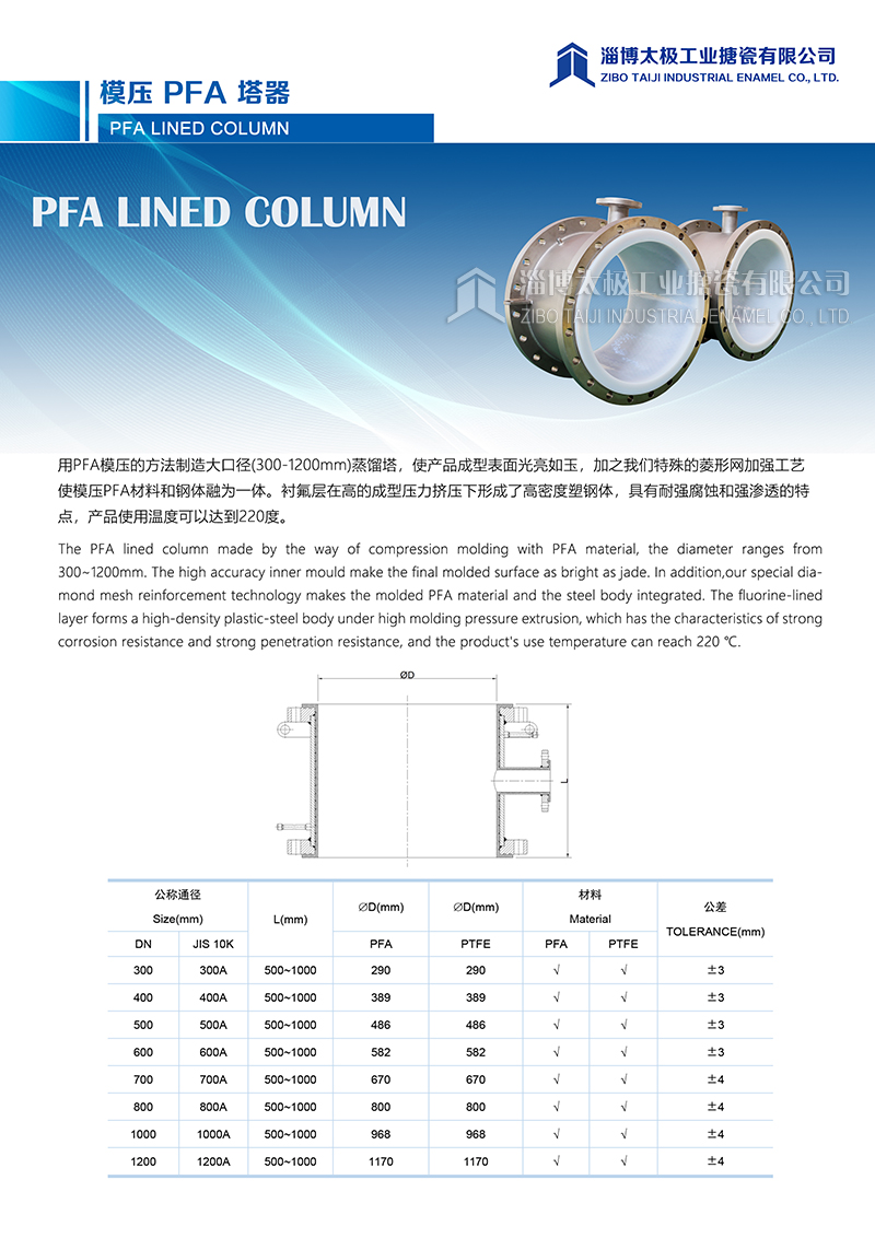 模壓PFA塔器 PFA LINED COLUMN 用PFA模壓的方法制造大口徑(300-1200mm)蒸餾塔,使產(chǎn)品成型表面光亮如玉,加之我們特殊的菱形網(wǎng)加強工藝使模壓PFA材料和鋼體融為一體。襯氟層在高的成型壓力擠壓下形成了高密度塑鋼體,具有耐強腐蝕和強滲透的特點,產(chǎn)品使用溫度可以達到220度。