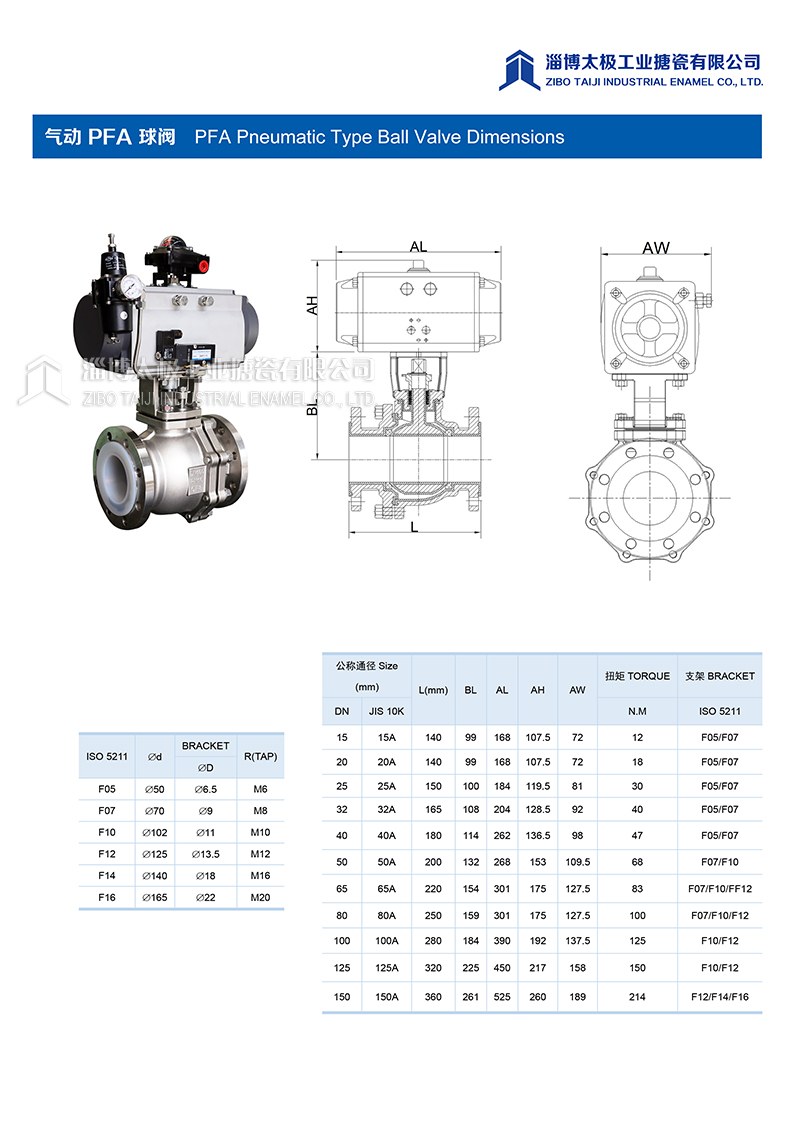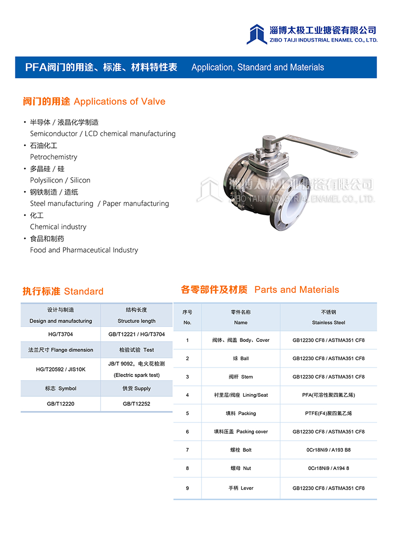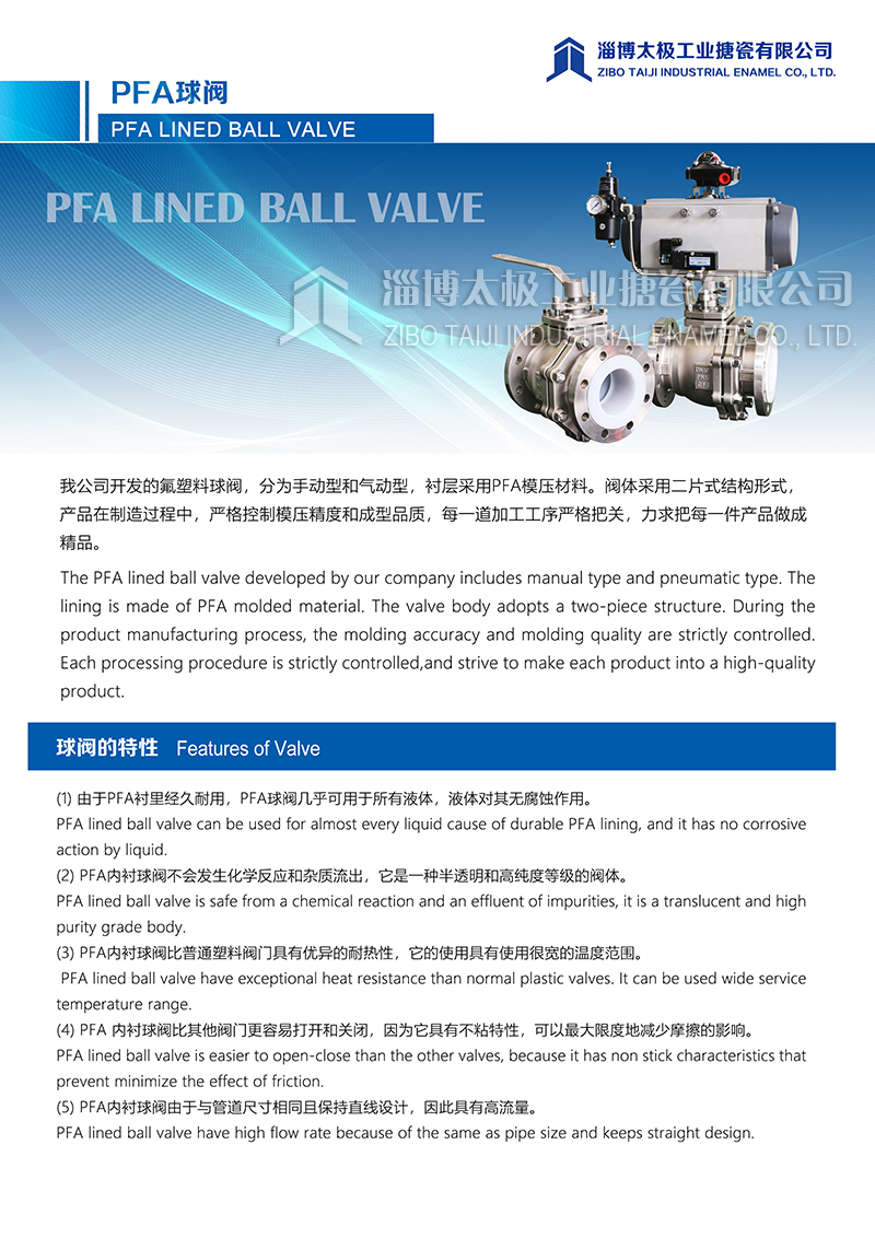 我太極公司開發(fā)的氟塑料球閥(PFA球閥),分為手動(dòng)型和氣動(dòng)型兩種類型,襯層采用PFA模壓材料。閥體采用二片式結(jié)構(gòu)形式,產(chǎn)品在制造過程中,嚴(yán)格控制模壓精度和成型品質(zhì),每一道加工工序嚴(yán)格把關(guān),力求把每一件產(chǎn)品做成精品。