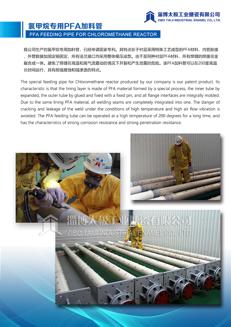 我公司生產(chǎn)的氯甲烷專(zhuān)用加料管,已經(jīng)申請(qǐng)國(guó)家專(zhuān)利。其特點(diǎn)在于襯層采用特殊工藝成型的PFA材料,內(nèi)管脹接,外管膠接加固定銷(xiāo)固定,所有法蘭接口均采用整體模壓成型。由于是同種襯層PFA材料,所有焊縫的焊接完全融合成一體。避免了焊縫在高溫和高氣流震動(dòng)的情況下開(kāi)裂和產(chǎn)生泄露的危險(xiǎn)。該P(yáng)FA加料管可以在200度高溫長(zhǎng)時(shí)間運(yùn)行,具有耐強(qiáng)腐蝕和強(qiáng)滲透的特點(diǎn)。