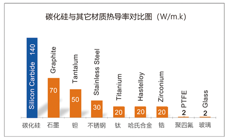 碳化硅換熱器熱導(dǎo)效率遠(yuǎn)遠(yuǎn)高于其它傳統(tǒng)耐腐蝕材料的換熱器;